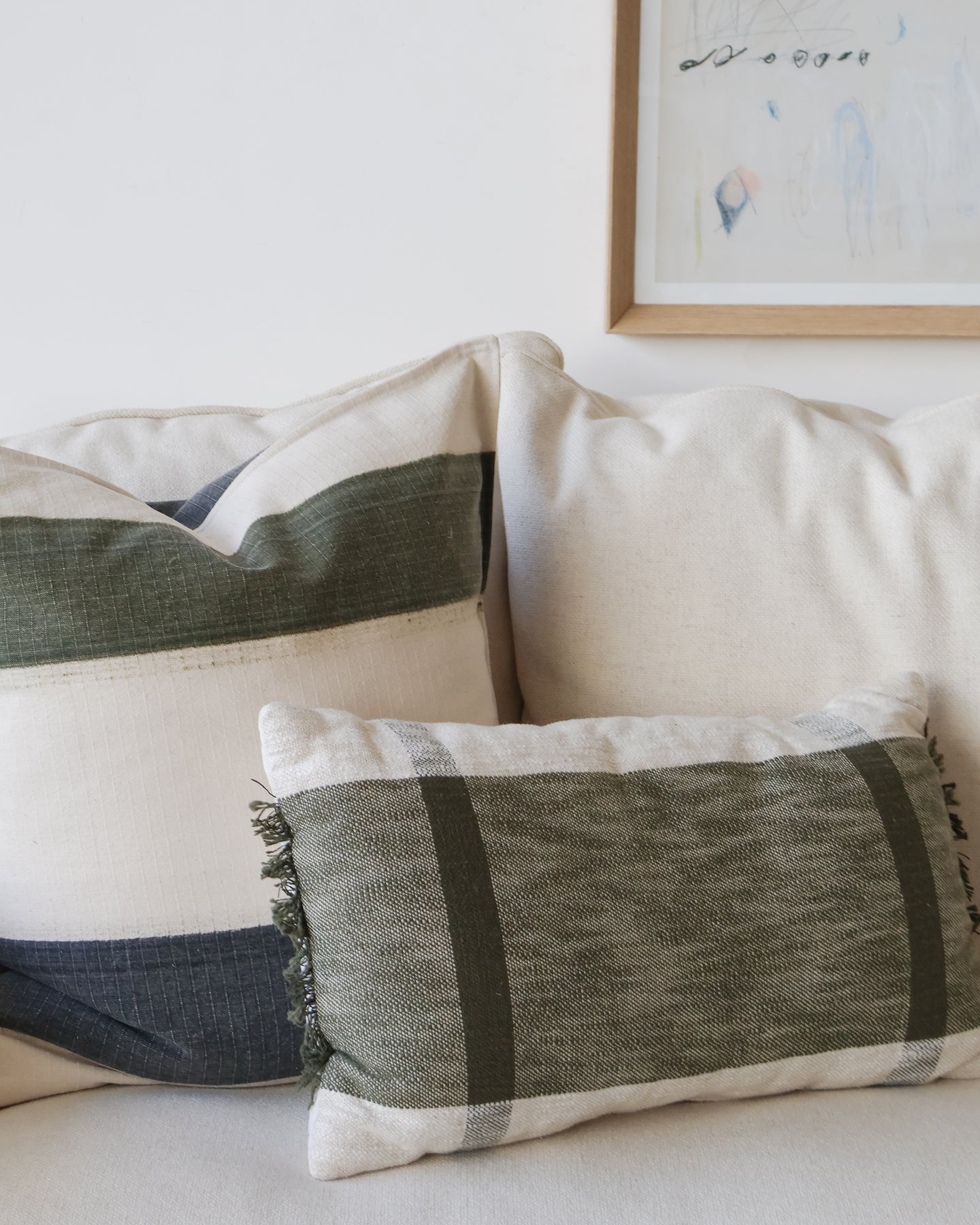 Con una base neutra y bloques amplios en verde oliva y azul profundo, esta almohada aporta un contraste sereno y muy equilibrado. Sus líneas limpias y su juego de tonalidades la convierten en una pieza ideal para sumar textura, profundidad y una estética contemporánea a cualquier sofá. Una elección que eleva el espacio con discreción y carácter.