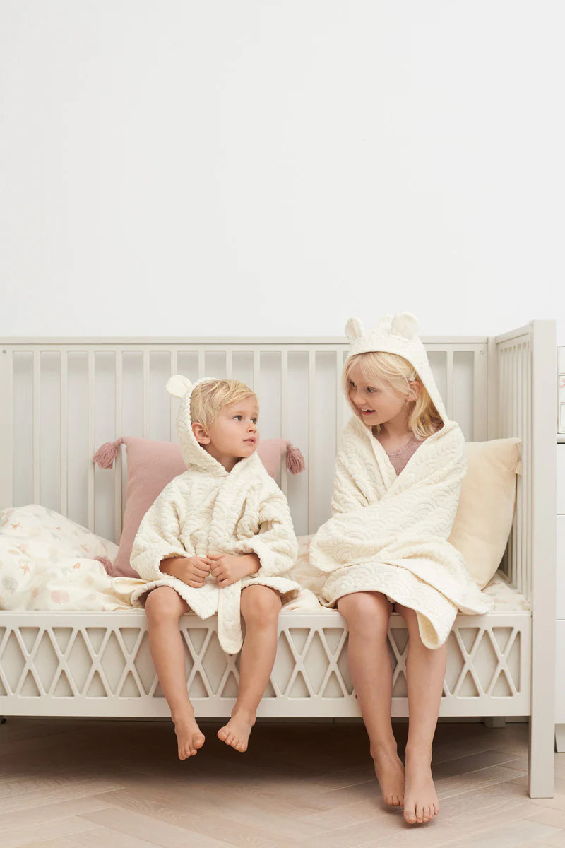 Esta encantadora toalla con capucha y orejas de conejo, hecha de algodón orgánico libre de químicos y en suaves tonos pasteles, es perfecta para envolver a tu pequeño después del baño. Su diseño divertido y acogedor brinda calidez y alegría, convirtiendo el momento del secado en una experiencia divertida.