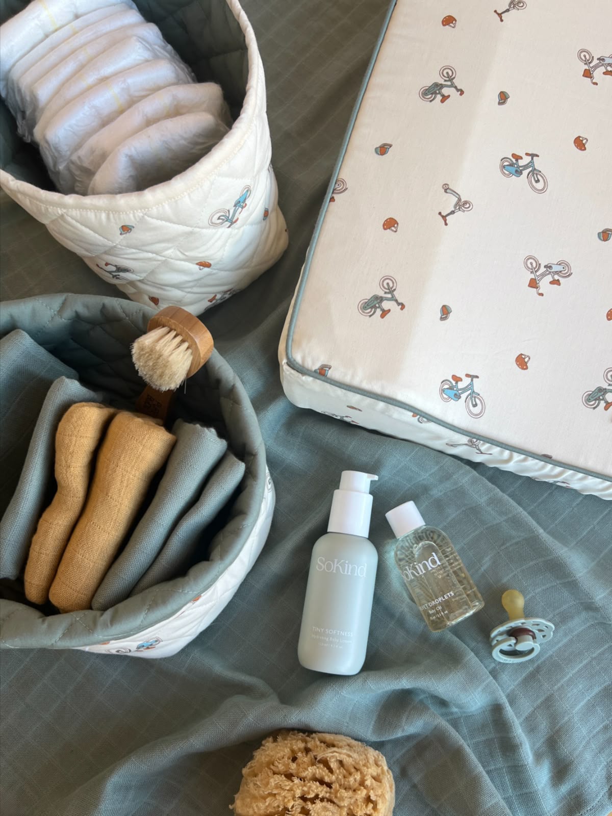 Cojín cambiador con una forma cómoda y bordes altos, que proporciona un buen soporte para el bebé. El cojín está hecho de espuma prensada en frío y tiene una funda extraíble y lavable.