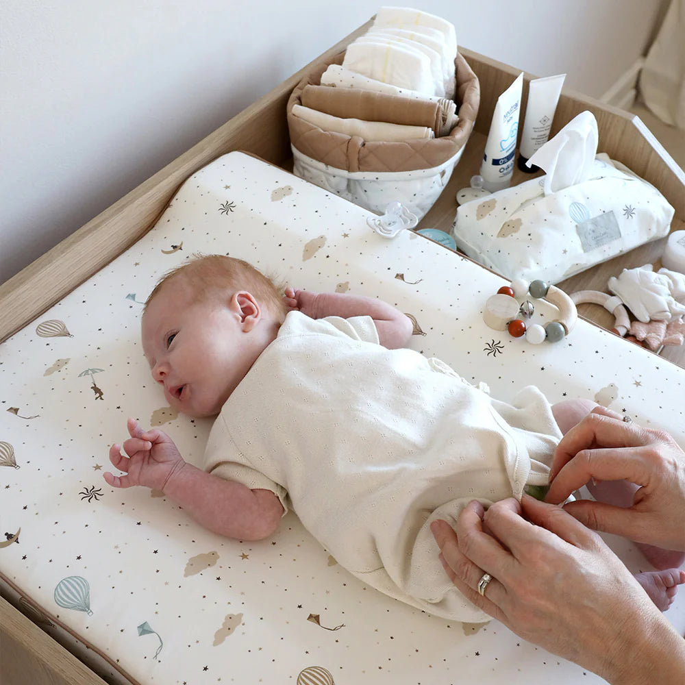 Nuestra funda de cambiador de bebé, confeccionada en algodón orgánico con encantadores estampados en tonos pasteles, es la solución perfecta para un cambio de pañal cómodo y elegante.