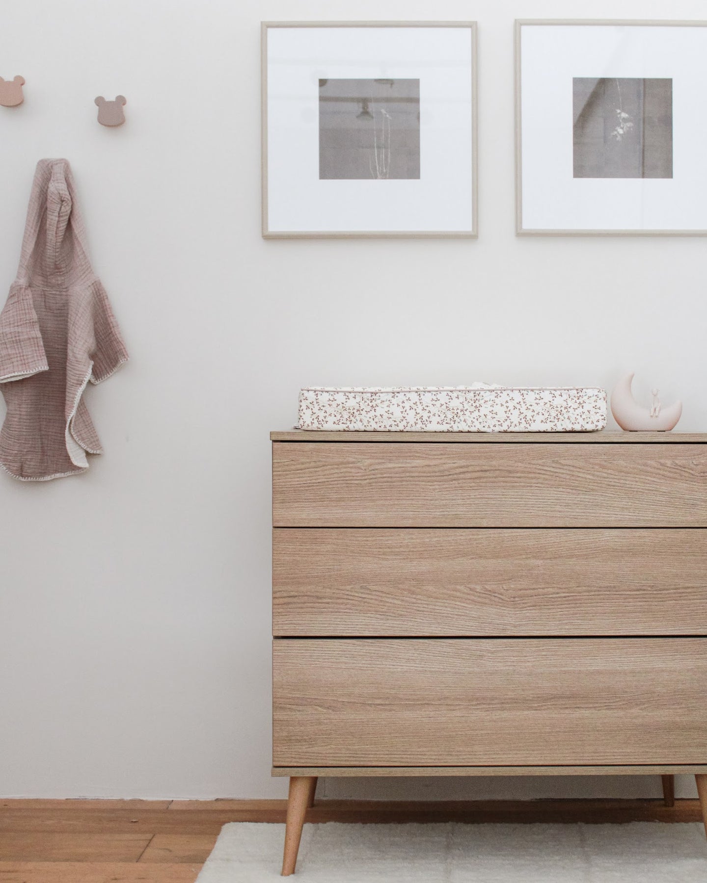 Diseñada con atención al detalle y practicidad, esta cómoda no sólo ofrece un amplio espacio de almacenamiento sino una superficie ideal para utilizar de cambiador. Fabricada con madera de alta calidad con certificación FSC, las patas son de madera maciza de haya, mientras que el resto de materiales son de aglomerado revestido de melamina. Este cofre no solo ofrece una apariencia lujosa sino también un amplio espacio para todas las necesidades de su bebé.