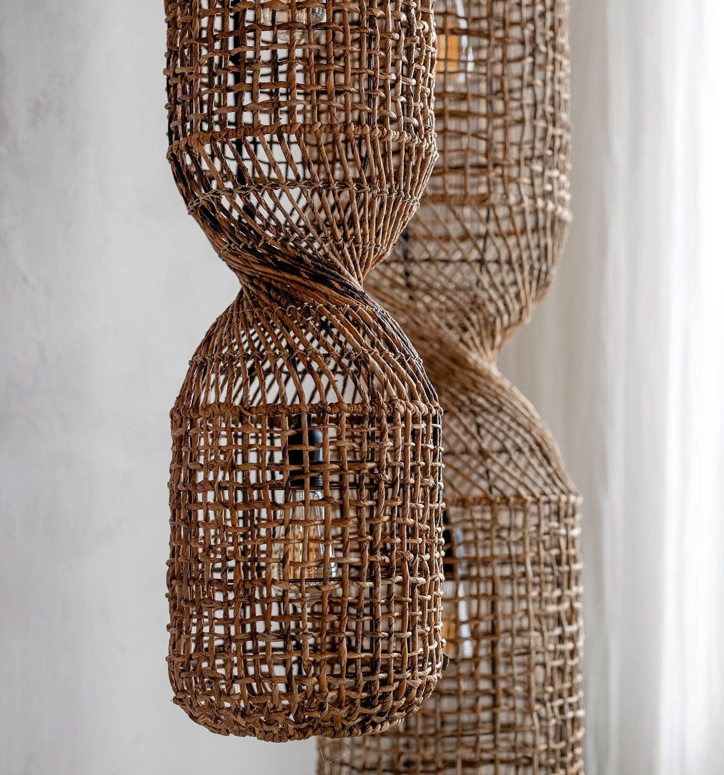 Disponibles en dos tamaños, las lámparas Pori se crean utilizando una estructura de aluminio y se envuelven magistralmente en corteza de abacá para crear una apariencia de tejido agradable y más rústico; luego, las lámparas se rematan con una cresta de teca recuperada torneada a mano.