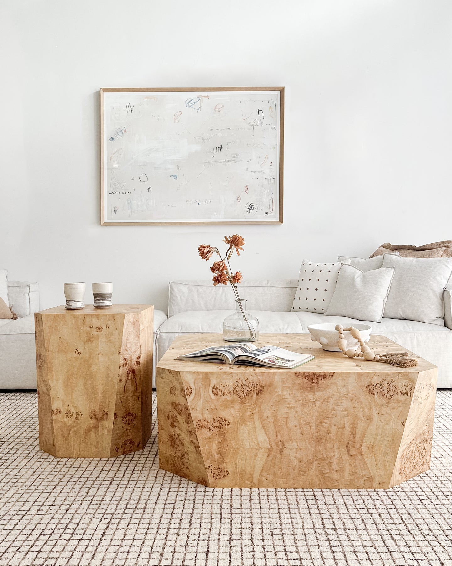 La mesa de centro Gales, hecha de madera burl wood, destaca por su estructura sólida y su forma geométrica angular, que transmite una sensación de modernidad y estabilidad. El veteado natural del burl wood le confiere un carácter único, con patrones orgánicos que aportan calidez y conexión con la naturaleza. Cada detalle de la madera, con sus nudos y texturas, hace que esta pieza sea visualmente rica y envolvente.
