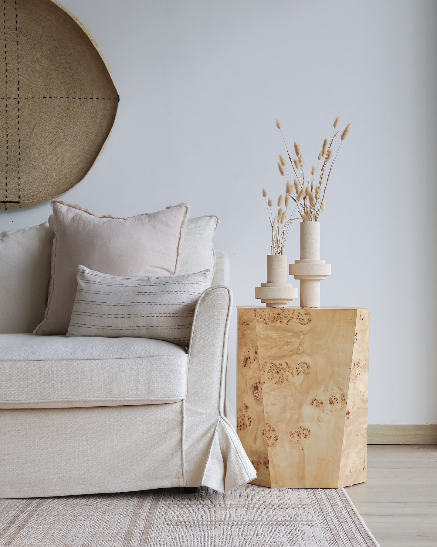 Destaca por su base geométrica y el uso de burl wood, que aporta carácter a través de sus vetas naturales y patrones únicos. La mesa evoca serenidad y una estética sutil, perfecta para ambientes que valoran la conexión con la naturaleza y la simplicidad en su decoración.