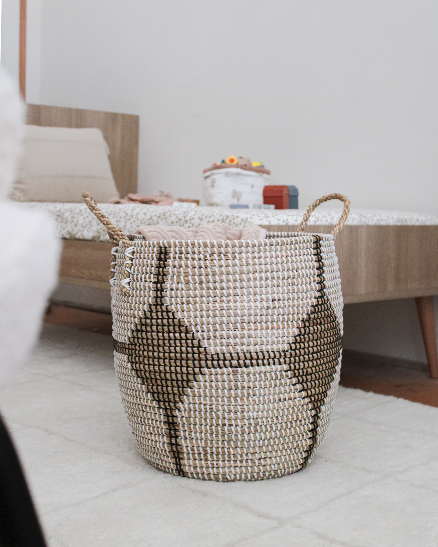 Cestos infantiles hechos a mano con pasto marino y detalles en PVC, ideales para organizar juguetes o ropa. Su diseño combina materiales naturales y resistentes, añadiendo un toque encantador y funcional a los espacios de los más pequeños.