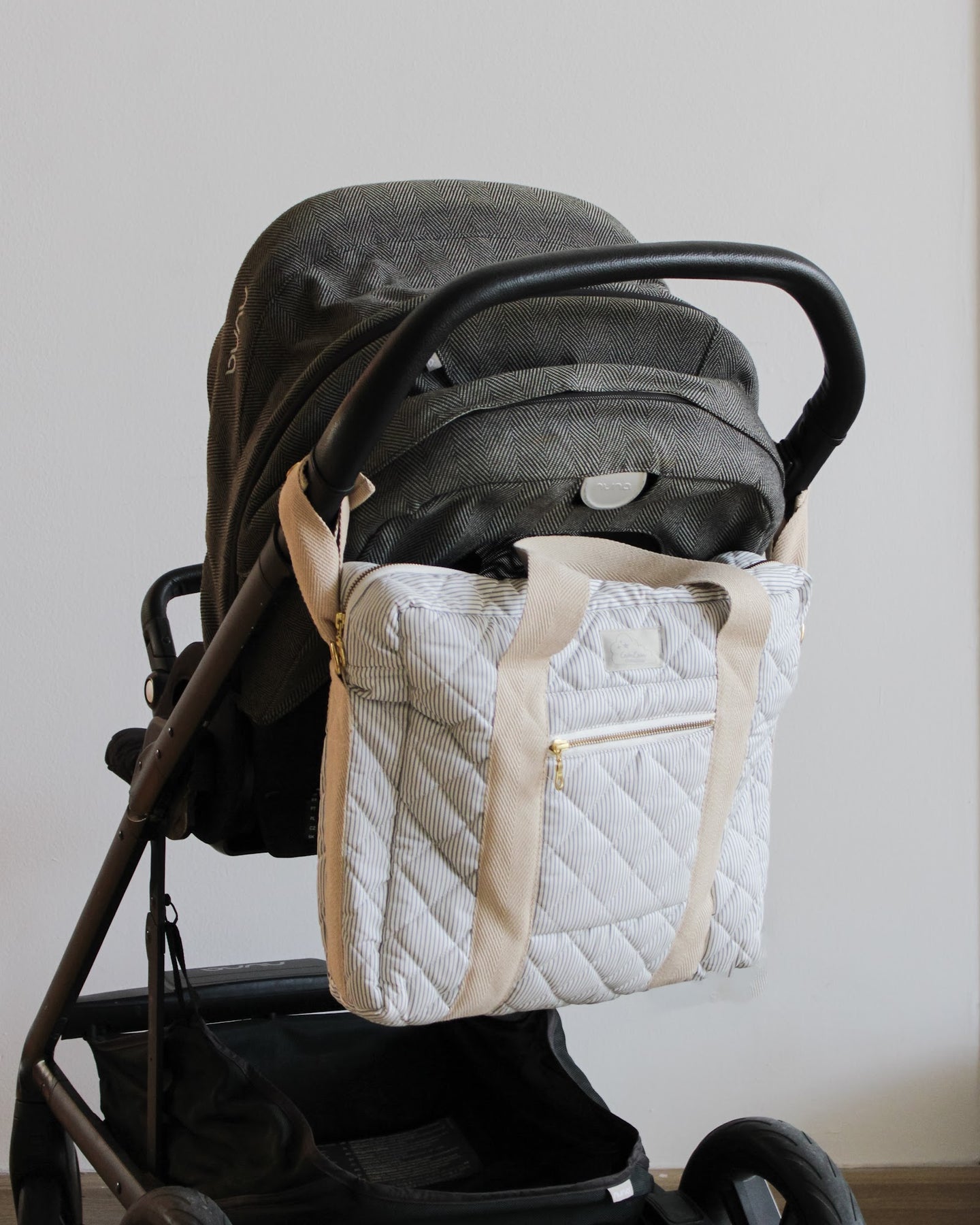 Este bolso cambiador con un elegante acolchado y revestimiento repelente al agua, tanto en el exterior como en el interior para una mayor protección y durabilidad. El bolso tiene correas resistentes, una correa ajustable para el hombro y dos pequeñas correas de asa para que puedas sujetarlo al asa del cochecito o la carriola.
