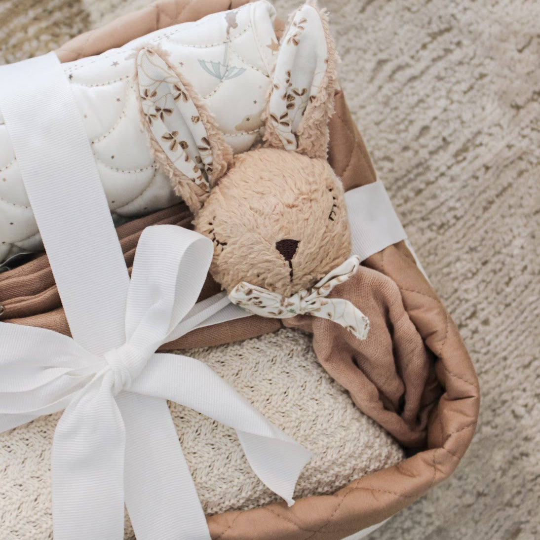 Incluye: 1 manta de punto, 1 conejo de apego, 1 paño de muselina, 1 portachupetes y 1 cambiador.