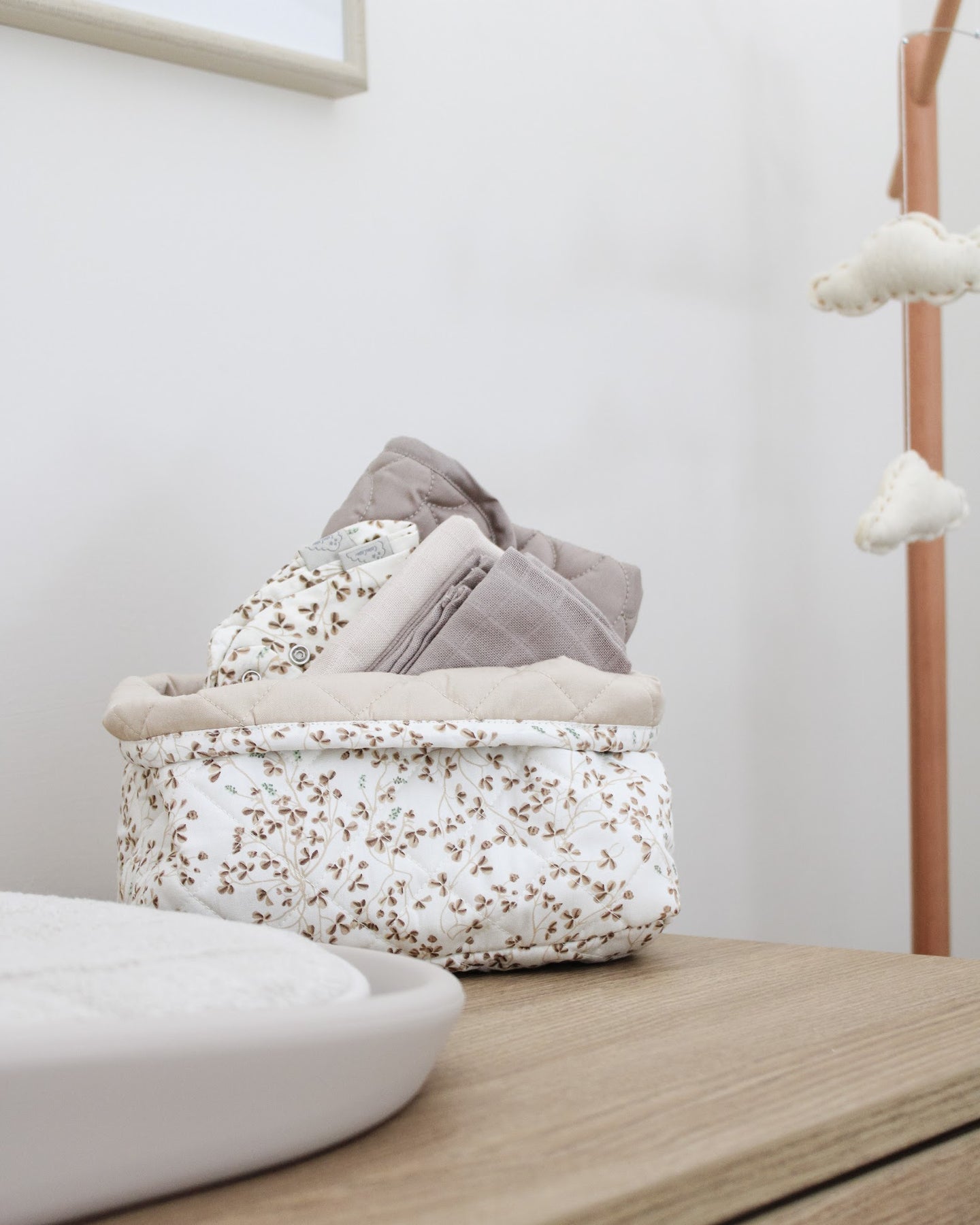 Una canasta de almacenamiento acolchada ideal para los elementos esenciales del cambiador, un juego de 2 baberos tipo bandana, un cambiador portátil para la vida familiar en movimiento y un juego de 2 paños de muselina de colores sólidos.