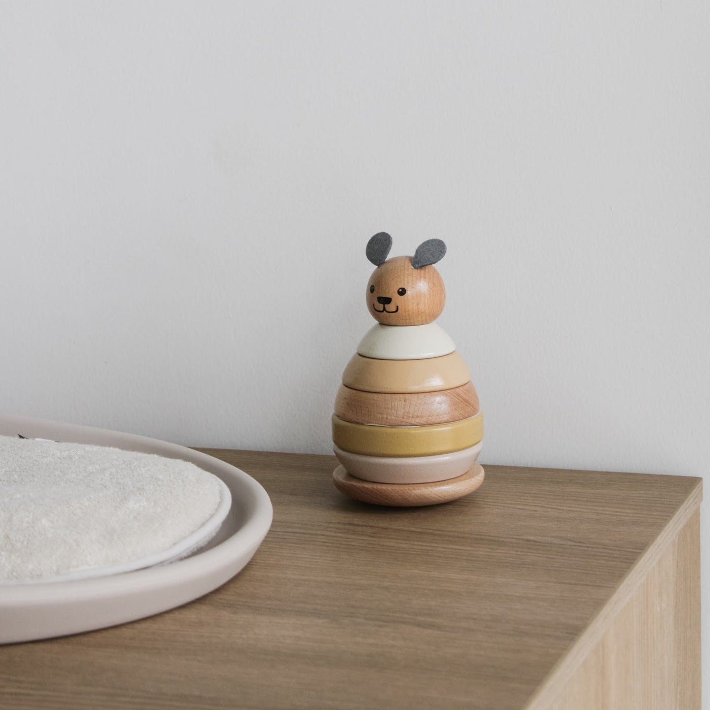 El juguete apilable de madera más lindo con una dulce carita de oso y orejas de fieltro para una estimulación táctil adicional.
