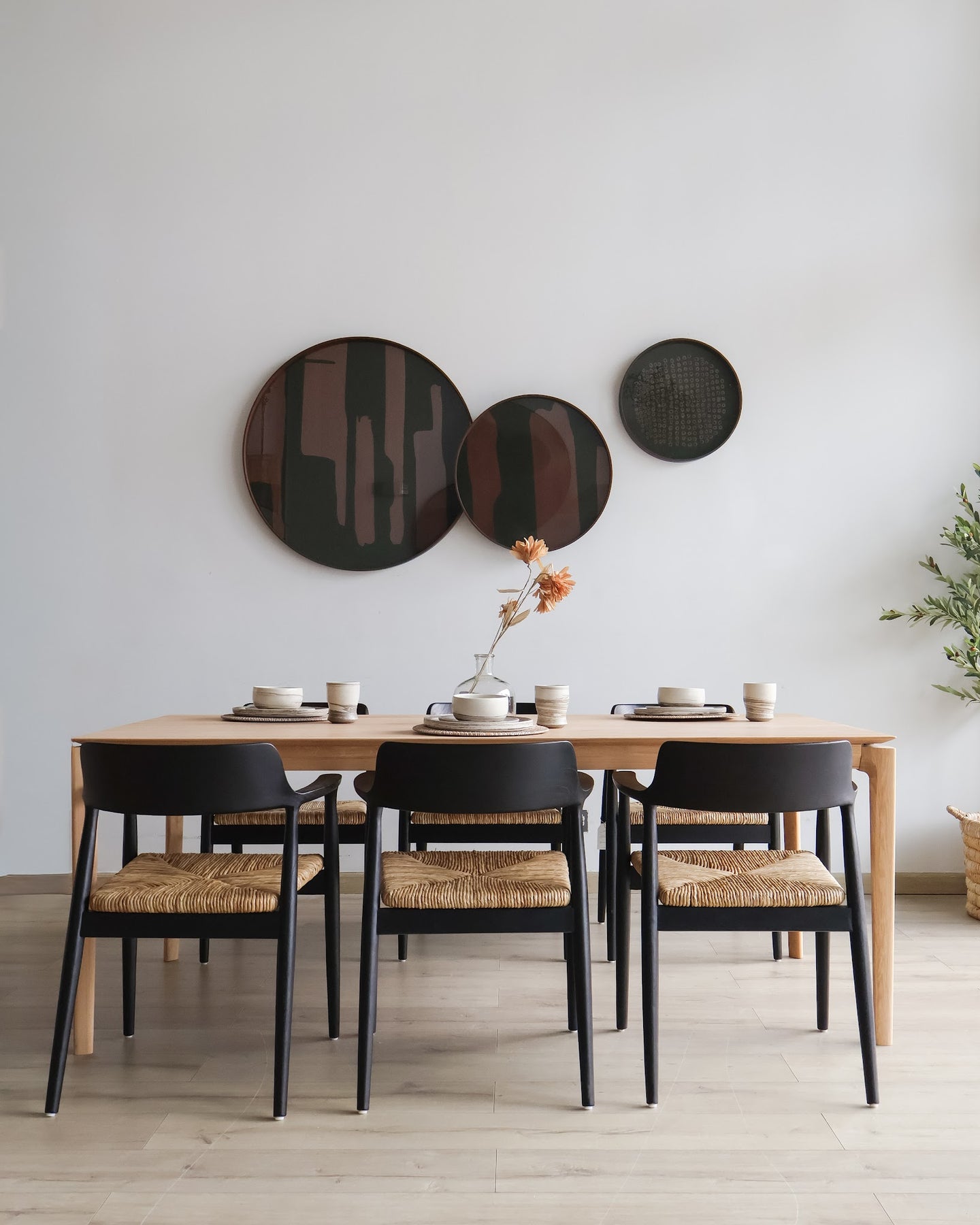 Patas delgadas y cónicas y un marco de teca natural definen la silla de comedor para interiores, informal pero elegante. Su asiento de mimbre tejido es una mezcla lúdica de materiales que le da un matiz visual a la silla y crea una estética acogedora y cálida.