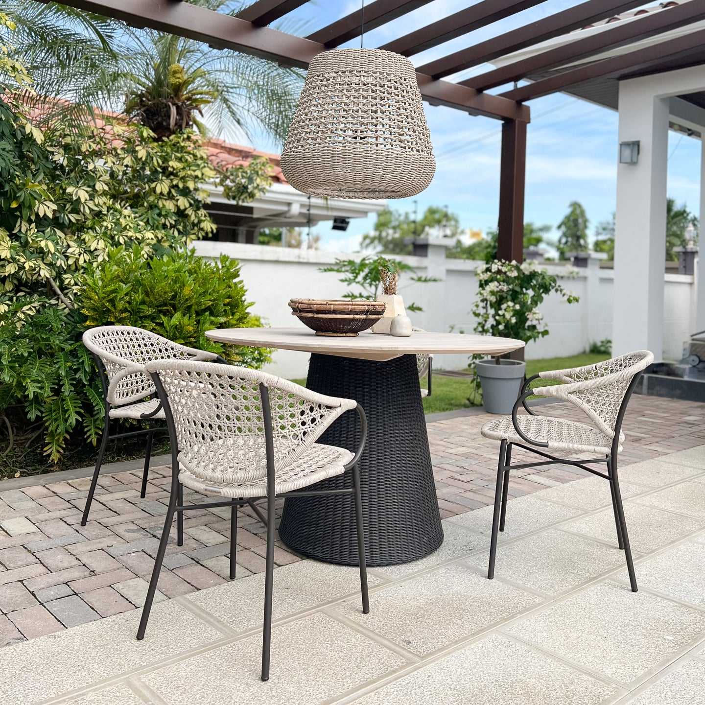 El asiento y el respaldo están tejidos con cuerda náutica premium, un material resistente a la intemperie y de secado rápido que añade textura y comodidad al diseño. La cuerda se adapta al cuerpo de manera ergonómica, brindando un soporte cómodo y flexible, perfecto para relajarse al aire libre. Su diseño sofisticado y moderno se adapta fácilmente a patios, terrazas o jardines, aportando un toque de estilo fresco y duradero.