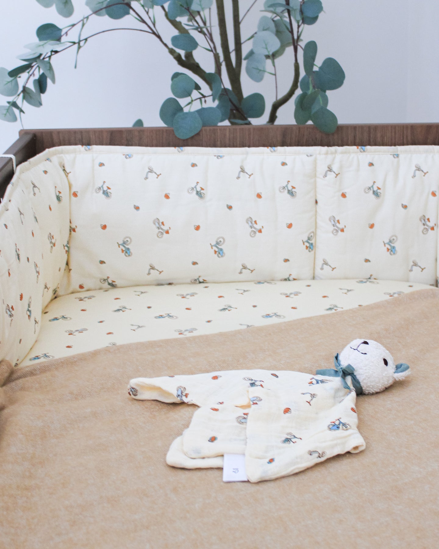 Nuestro Bumper para cuna está elaborado en algodón orgánico y presenta suaves estampados en tonos pasteles, ideales para crear un ambiente seguro y acogedor. Diseñado para proteger a tu bebé de golpes mientras duerme, este bumper combina estilo y seguridad en una variedad de patrones encantadores que complementan cualquier decoración infantil.