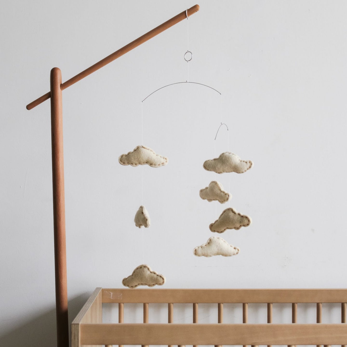 Este encantador móvil para bebé está diseñado para crear un ambiente tranquilo y relajante en la habitación infantil. Sus suaves nubes hechas a mano están confeccionadas con algodón orgánico y relleno hipoalergénico. Cada nube está delicadamente suspendida con finos hilos transparentes o de yute natural, permitiendo un suave movimiento que simula el flotar en el cielo.