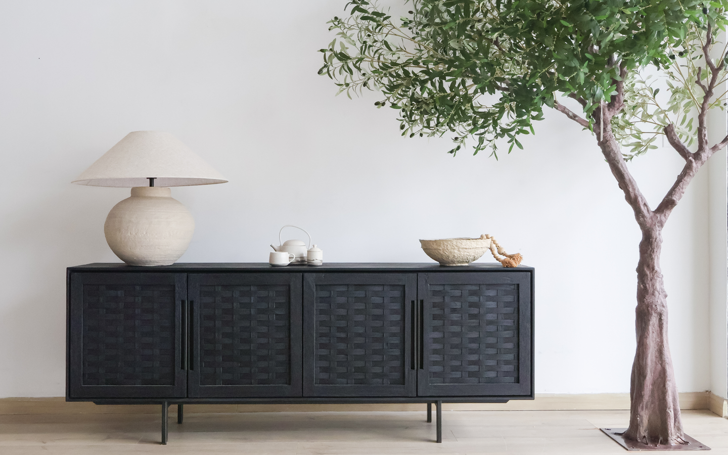 Para esta preciosa pieza de cuatro puertas se utilizan diversas técnicas artesanales. Está hecha a mano con madera recuperada, tiene patas de hierro y puertas bellamente estructuradas de ratán tejido a mano.