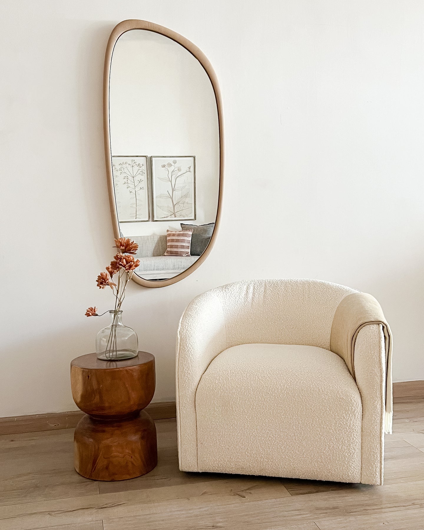El espejo Zamu es una pieza de decoración única que combina la utilidad de un espejo con un diseño suave y curvilíneo inspirado en la naturaleza. Su marco moldeado en formas orgánicas y su espejo central no convencional crean un punto focal visualmente atractivo y elegante en cualquier espacio.