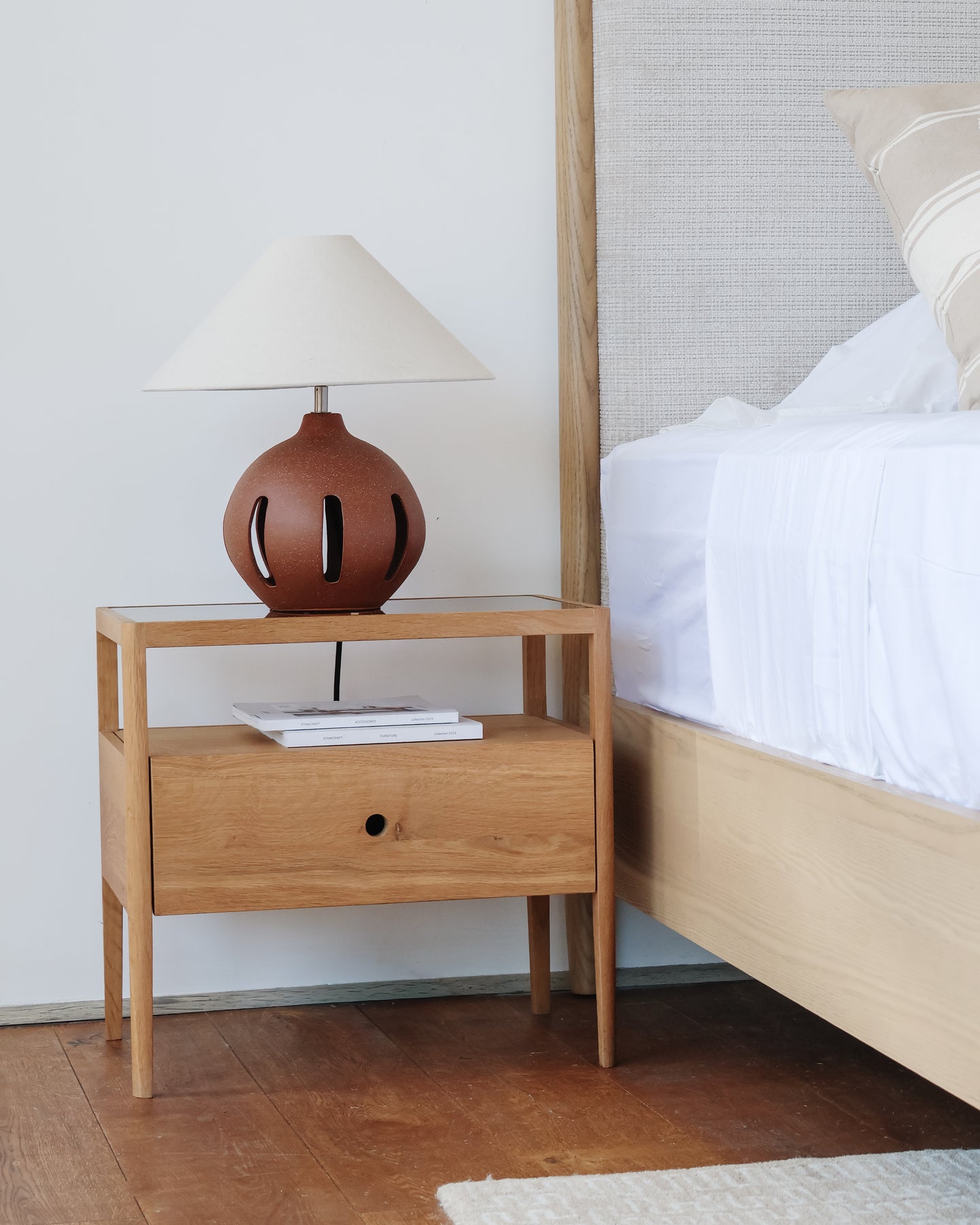 Con su cajón, espacio abierto y patas ligeramente cónicas, la mesita de noche Linz es la compañera perfecta y sensata para tu cama. El roble natural ofrece un acabado verdaderamente único para todos y cada uno de los artículos: el origen de cada mueble acabado a mano tiene su propia historia en su material.