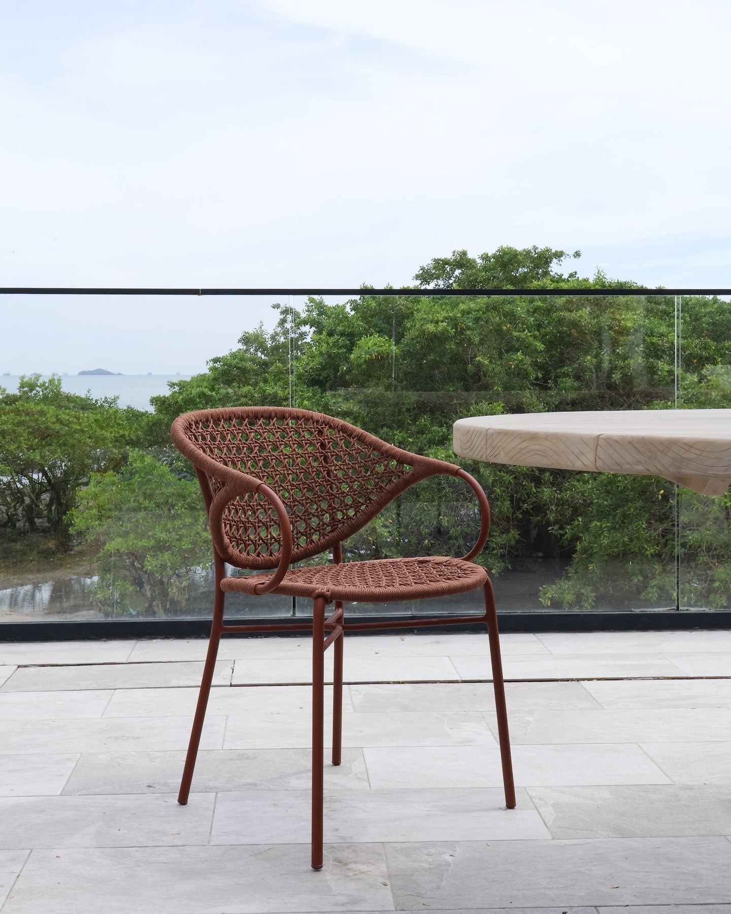 El asiento y el respaldo están tejidos con cuerda náutica premium, un material resistente a la intemperie y de secado rápido que añade textura y comodidad al diseño. La cuerda se adapta al cuerpo de manera ergonómica, brindando un soporte cómodo y flexible, perfecto para relajarse al aire libre. El diseño sofisticado y moderno de la silla Kuwait se adapta fácilmente a patios, terrazas o jardines, aportando un toque de estilo fresco y duradero.